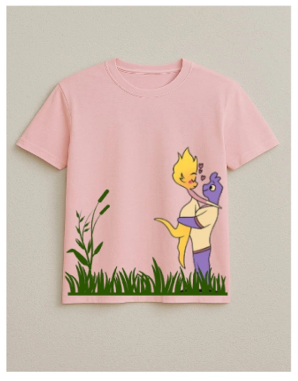 This white tee features a playful, cartoon-style couple locked in a sweet, animated moment, surrounded by grass and leafy elements for a natural, carefree vibe. With its bold colors and expressive art, it’s perfect for those who wear their heart (and humor) on their sleeve.